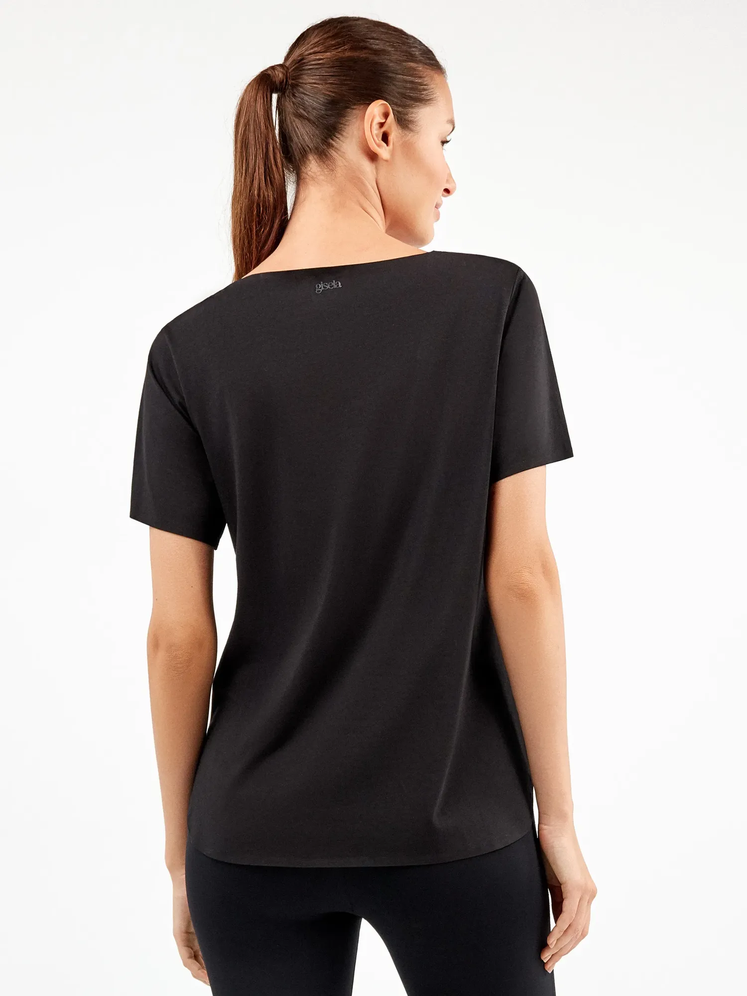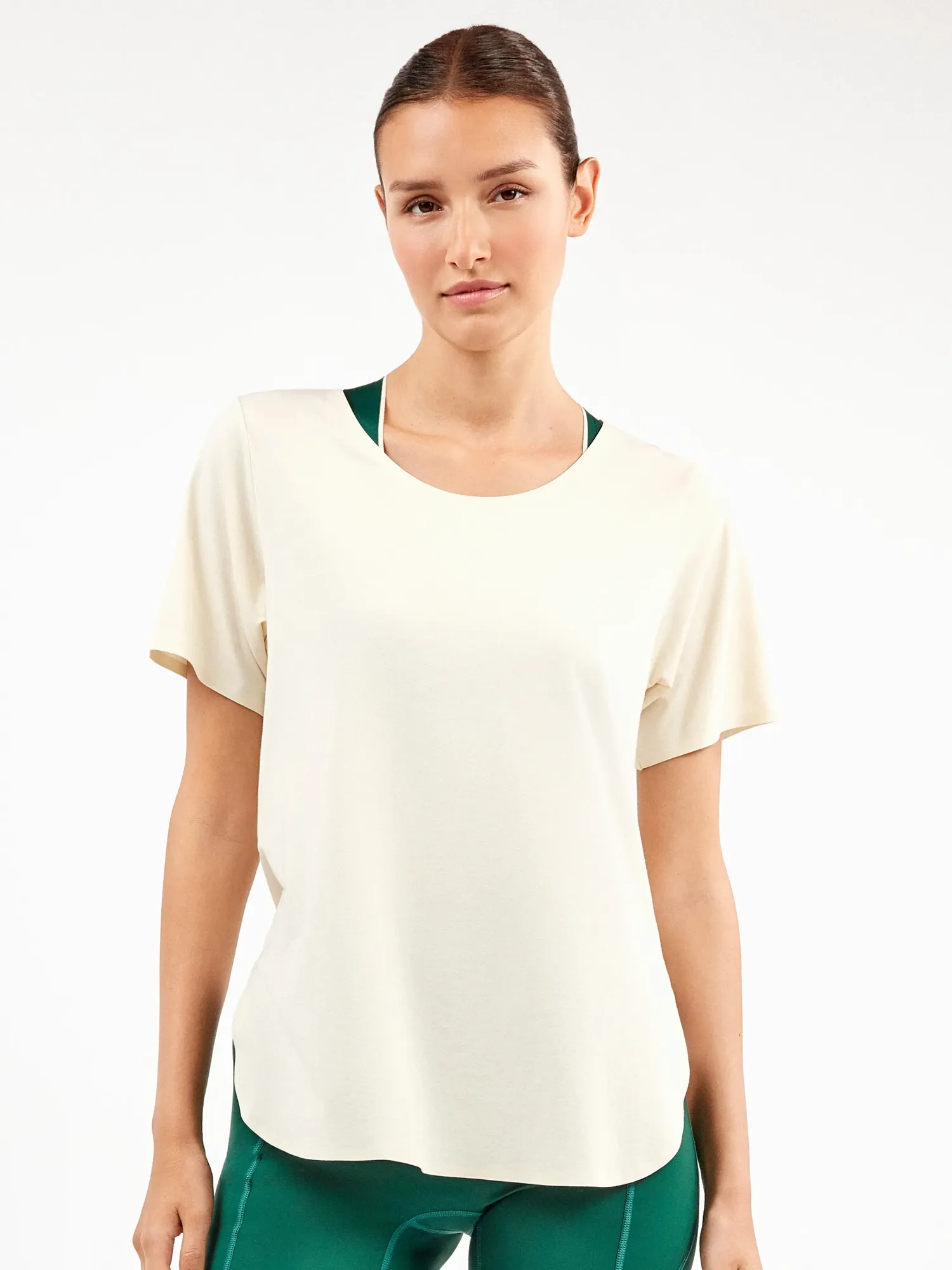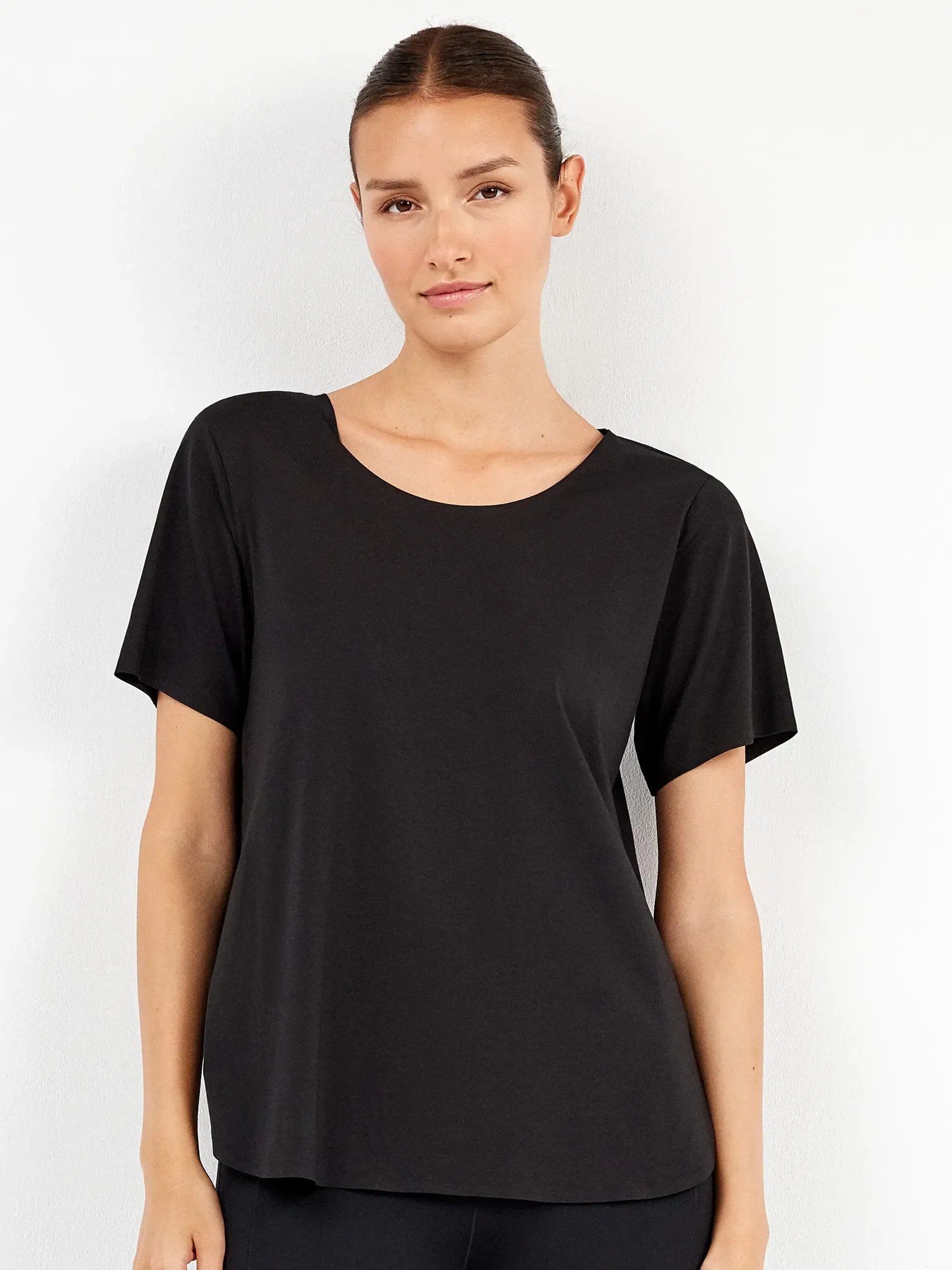 Camiseta deportiva de manga corta y larga, aperturas laterales para mayor movilidad y feminidad y acabados termofusionados que la liberan de cualquier costura confeccionada en viscosa y algodón. Disponible en crudo y negro.