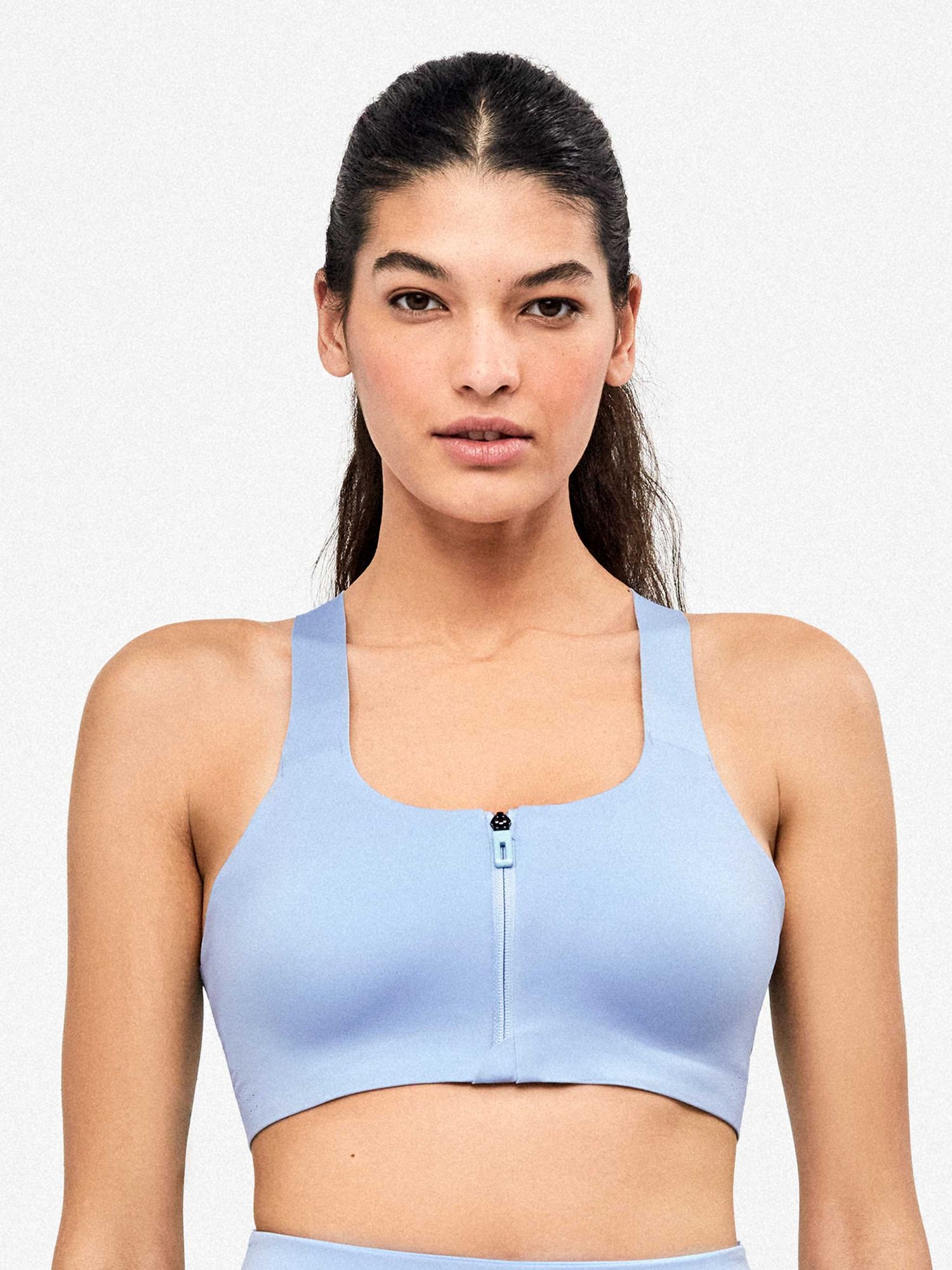 Sujetador deportivo de alta sujeción con cierre delantero cremallera. Pieza que cubre la parte inferior de la cremallera para evitar el roce. Copas preformadas y espalda mariposa con tirantes ajustables. Tejido microperforado para una mayor transpiración y aporte de diseño. Acabados termofusionados. Disponible en dos colores.
